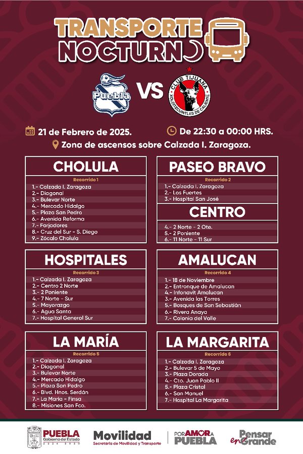 La Secretaría de Movilidad y Transporte del estado de Puebla informó que al terminar el partido entre el Club Puebla y los Xolos de Tijuana habrá transporte público nocturno.