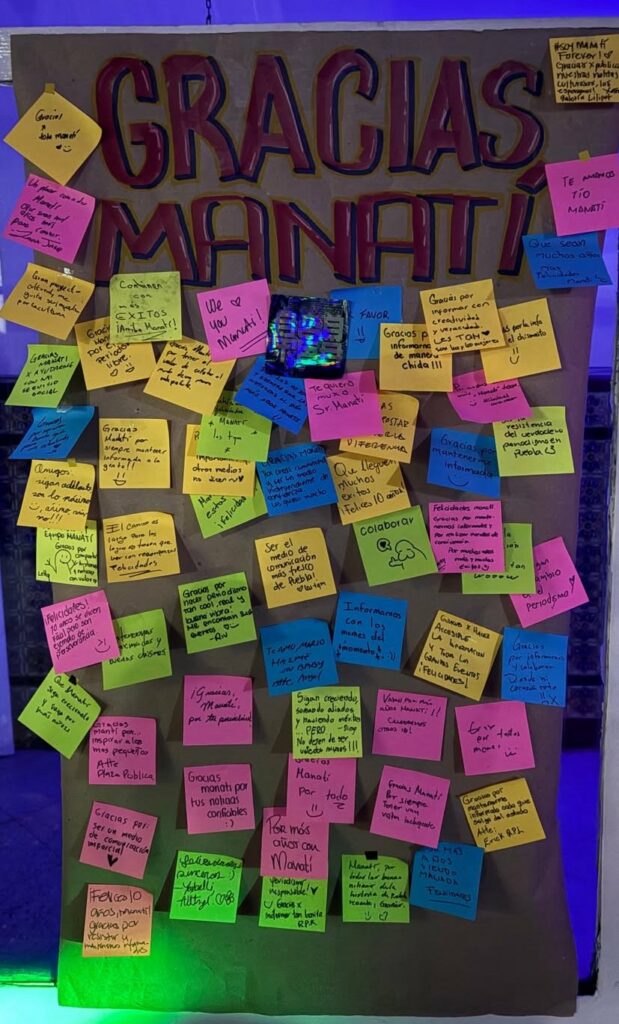 Una de las escenas más bonitas de la noche fue el mural de Manada Cultura de Paz, donde muchas personas escribieron mensajes para Manatí: palabras de agradecimiento, recuerdos, deseos para los próximos años y hasta anécdotas que nos hicieron sonreír.